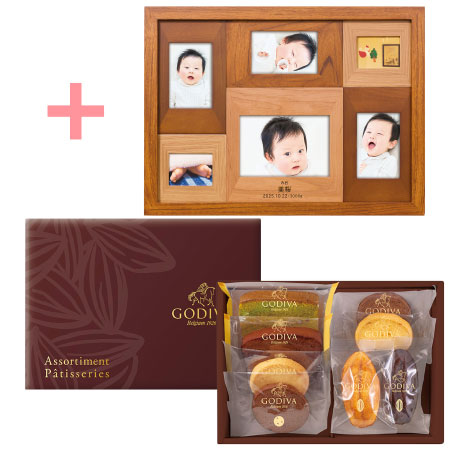 【旬ギフト】名入れ木製壁掛けフォトフレーム(大)とゴディバ パティスリーアソートメント8個入