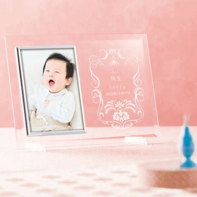 王冠と花をモチーフにしたデザインが美しいガラスのフォトフレームに、お子さまのお名前、生年月日、出生時の体重をレーザーで入れてお届けします。