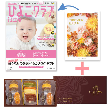 • 【旬ギフト】「ひよこクラブ」なりきり表紙 写真&名入れカタログ テイクユアチョイス カルミアとゴディバ パティスリーアソート13個入_補足画像01