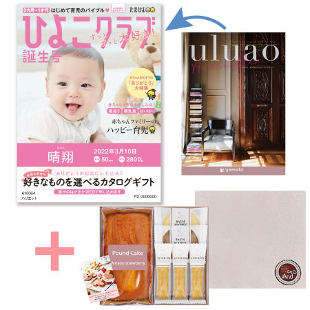 「ひよこクラブ」なりきり表紙でお子さまの写真をお披露目! たまひよだけのスペシャルなカタログギフトに、あまおう苺パウンドケーキと焼き菓子のセットを添えてお届けします。