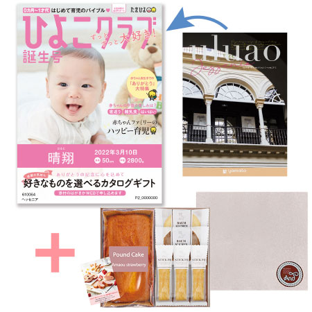 「ひよこクラブ」なりきり表紙でお子さまの写真をお披露目! たまひよだけのスペシャルなカタログギフトに、あまおう苺パウンドケーキと焼き菓子のセットを添えてお届けします。
