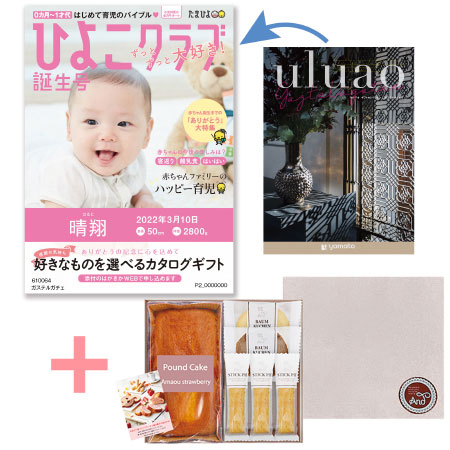 「ひよこクラブ」なりきり表紙でお子さまの写真をお披露目! たまひよだけのスペシャルなカタログギフトに、あまおう苺パウンドケーキと焼き菓子のセットを添えてお届けします。