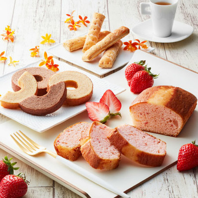 セットでお届けするのは、あまおう苺パウンドケーキと焼き菓子の詰め合わせ。あまおう苺果汁を100%使用したパウンドケーキ、一層一層ていねいに焼き上げた2種類のバウムクーヘン、サクッと焼き上げたスティックパイをお楽しみいただけます。