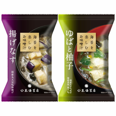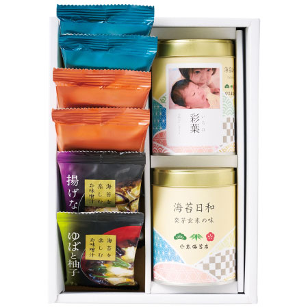 ■内容:海苔日和20g×2缶(うめの味・発芽玄米の味×各1)、銘々焼海苔(8切6枚)×2袋、銘々味附海苔(8切6枚)×2袋、味噌汁×2(揚げなす・ゆばと柚子×各1)
