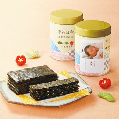 海苔日和(うめの味)缶のラベルに、お子さまの写真とお名前、生年月日をお入れしてお届けします。