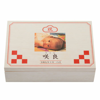 木箱のふたにお子さまの写真とお名前、生年月日をお入れします。