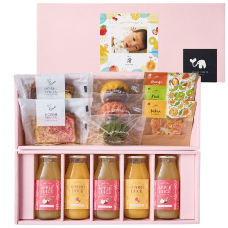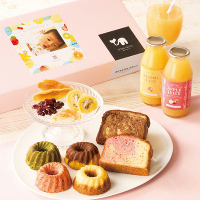 フルーツ専門店ならではの焼き菓子と国産果汁100%のジュースのセットを、お子さまの写真とともに。