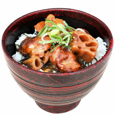 ■照り焼きマヨ仕立て根菜と焦がし鶏 根菜と焦がした鶏肉が入ったどんぶり用の具です。