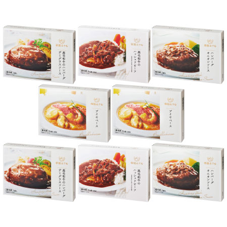 ■内容:黒毛和牛のハンバーグデミグラスソース190g×2、黒毛和牛のハッシュドビーフ185g×2、ハンバーグオニオンソース200g×2、ブイヤベース220g×2