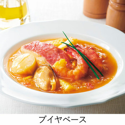 ■ブイヤベース 魚介類から出るエキスを十分に引き出したスープをベースに、ていねいに炒めたポロ葱とトマトを加えサフランで仕上げました。具材には金目鯛やエビ、イカなどを使用しぜいたくに仕上げたブイヤベースです。魚料理としてもスープとしてもお楽しみいただける逸品です。