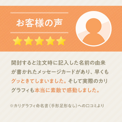 お名前から連想した世界に一つのデザインを残せます。ご自宅用にはもちろん、ご両親へのプレゼントにもおすすめです。