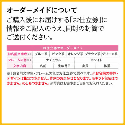 こちらの商品は原材料等の高騰に伴い2024年9月3日より販売価格を改定致しました人気のグラフィックデザイナーが、お名前に合わせたカリグラフィを一つひとつ手書きでデザイン。世界で一つの、記念に残る命名書つきフォトフレームです。おしゃれなカリグラフィの中には、「お名前」だけでなく「生年月日」「身長」「体重」も。お名前の文字色はお子さまのイメージに合わせて5色からカラーをお選びいただけるので、まさに世界に一つの誕生記念!こちらはたまひよでしか買えない「たまひよ限定のオリジナルデザイン」商品です。<月子>デザイン専門学校卒業後、百貨店POPライター、外食産業会社企画、デザイン事務所を経て絵の具や墨の持ち味を生かした手書き文字を中心とするグラフィックデザイナー。名前、年賀状、ロゴ、タイトル、パッケージ、POP等のデザインを手掛けている。■そのほかの「たまひよのアニバーサリー」商品はこちら■「カリグラフィ命名書付き フォトフレーム(手形足形あり)【お仕立券】」はこちら■配送のご注意●商品によって出荷元、出荷日が異なるため別々のお届けとなる可能性があります。※こちらの商品には、包装紙・のし・「写真でごあいさつカード」はつきません。============================【重要】お届け、お支払い、有効期限についてのお知らせ●お支払いはクレジットカード又はコンビニ振込となります。●お仕立券のお届け先についてこちらの商品をご注文いただくと、お仕立券という専用申込用紙をご注文者様宅にお届けします。ギフト用として別のお届け先を指定された場合でも、完成した商品をお届け先様へお届けできるようにするため、お仕立券はご注文者様宅にお届けしますのでご注意ください。別のお届け先がある場合は、お仕立券の専用申込用紙にてご指定いただけます。●商品のお届けについて必要事項をお仕立券にご記入の上、専用封筒でメーカーに投函すると、約1カ月後にメーカーより商品をお届けします。商品の配達曜日・時間帯の指定はできません。●お支払いについてお仕立券の投函が数か月後になる場合、一緒に注文した他の商品のご請求も遅くなることがあります。【クレジットカードの場合】お仕立券投函後に作成する商品を含む、すべての商品をお届け後に、ご注文金額をご指定の口座からの引き落としいたします。【コンビニ振込の場合】お仕立券投函後に作成する商品をお届けした後、一緒に注文した他の商品と合わせた金額の請求書(ハガキ)をお届けする場合があります。●お仕立券の有効期限についてお仕立券の有効期限はお届けより1年間となっています。期限を超えた場合は、商品をお届けできませんので、早めの投函をお願いいたします。===========================