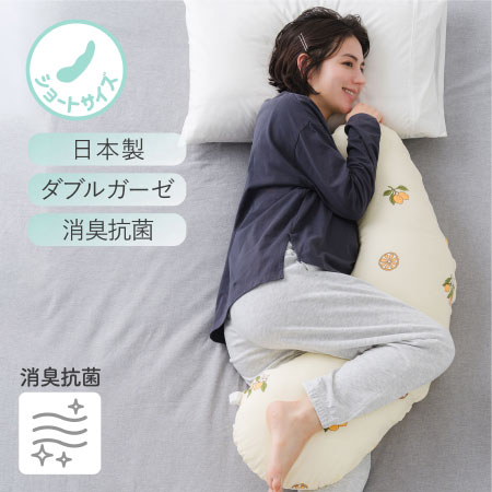 日本製のやわらかなダブルガーゼ素材でつくられた、妊婦さんとママのためのショートタイプ抱き枕です。