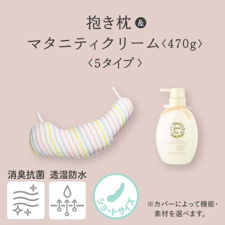 妊婦さんの快適な眠りと肌ケアにぴったりの、ショートタイプ「抱き枕」と「ナチュラルマーククリーム」470gのセット。たまひよSHOPで大人気の2商品を組み合わせたセットです。