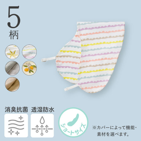 綿100%ダブルガーゼ素材は通年使いやすく、赤ちゃんにもやさしい素材です。暑いときにはさらりと肌離れもよく、軽やかながらも、寒いときにはガーゼ素材の間に空気を含むので、ふんわりとやさしく感じられます。「消臭抗菌」「透湿防水」などの機能性素材まで豊富なラインナップをご用意しました。汚れが気になったときにあると便利な替えカバーです。